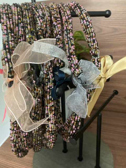 Add a touch of elegance and artistry to your accessory collection with this handcrafted multicoloured beaded rope necklace. Featuring a beautiful blend of black, gold, pink, and clear seed beads, this piece offers a rich, textured look that complements both casual and dressy outfits. Each bead is carefully woven to create a flexible, lightweight rope design that drapes comfortably and adds eye-catching dimension.